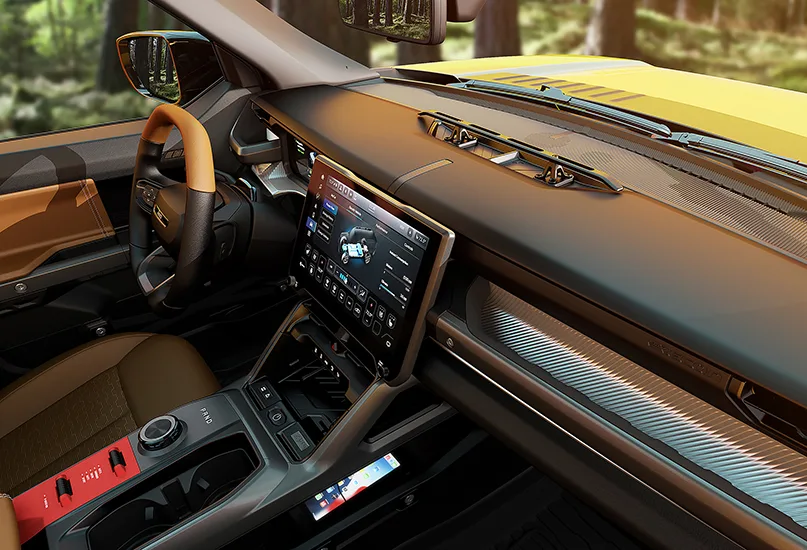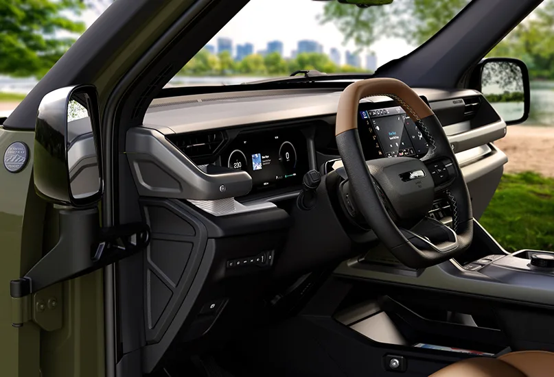 The interior layout emphasises visibility and ease of use, reinforcing its dual role as both a capable trail vehicle and a comfortable daily driver.
